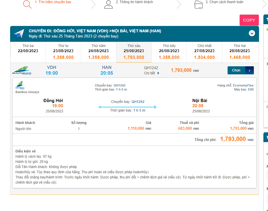 Đồng Hới (VDJ) đến Nội Bài (HAN) thứ Sáu 25/08/2023