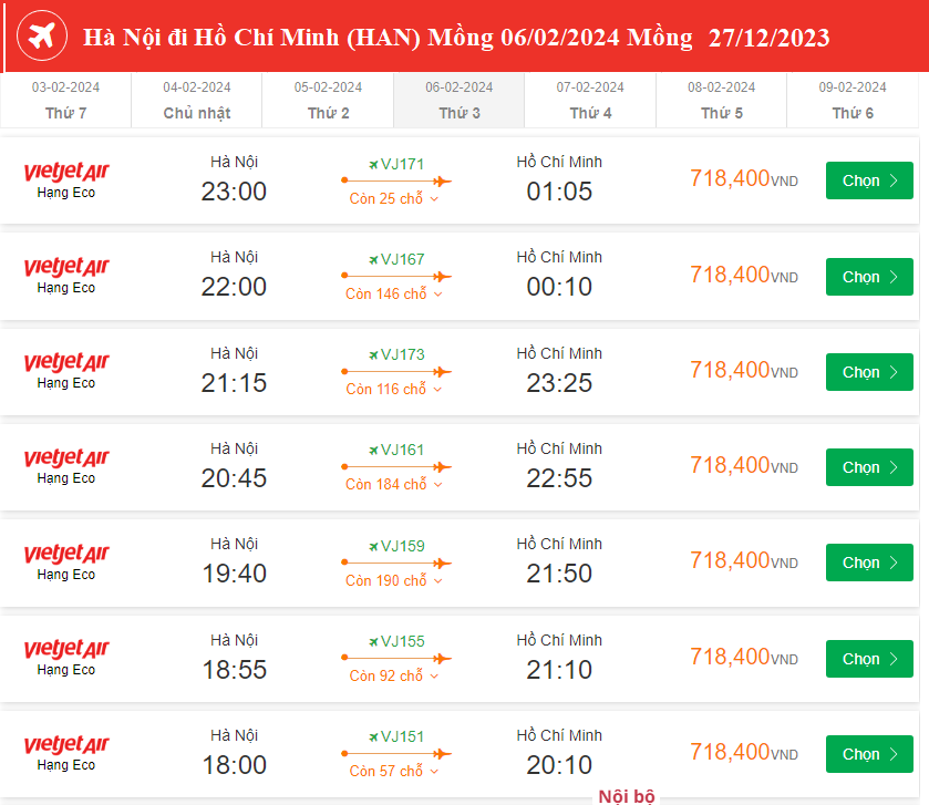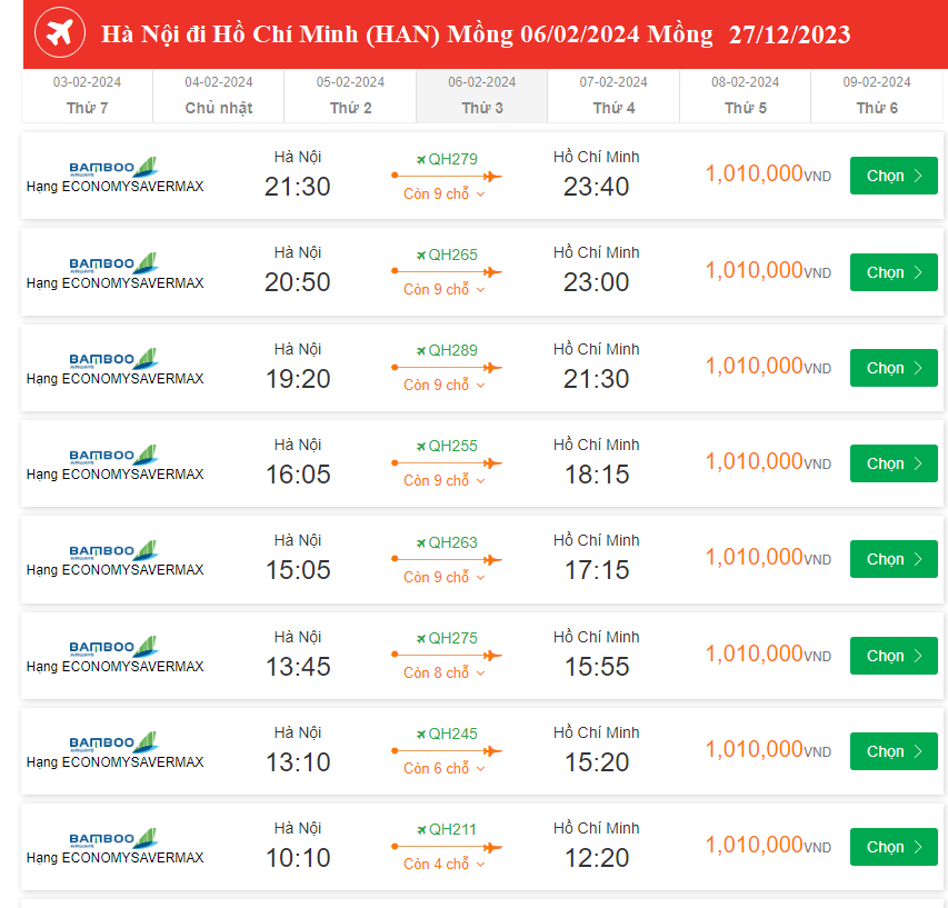Hà Nộ đi Hồ Chí Minh (HAN) Mồng 06/02/2024 Mồng 27/12/2023