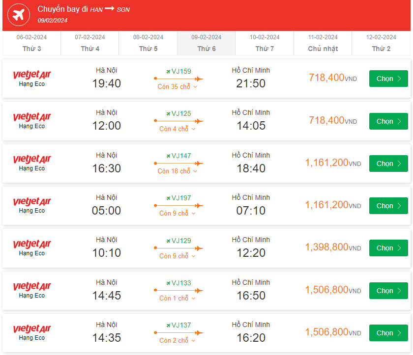 Hà Nộ đi Hồ Chí Minh (HAN) Mồng 09/02/2024 Mồng 30/12/2023