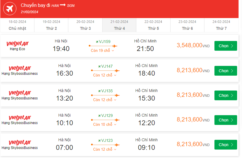 Hà Nộ đi Hồ Chí Minh thứ 4 21/02/2024