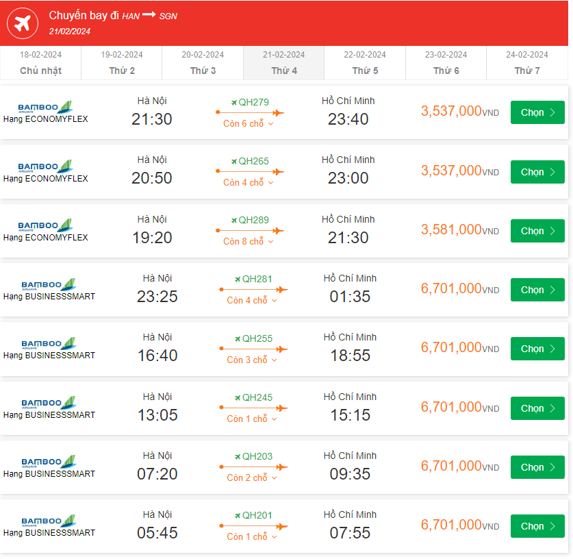Bamboo Airways Hà Nội Cất cánh: 21:30 Ngày: 21-02-2024 Hồ Chí Minh Hạ cánh: 23:40 Ngày: 21-02-2024 Chuyến bay: QH279 giá vé máy bay 3,537,000VND (giá hãng 3,467,000)