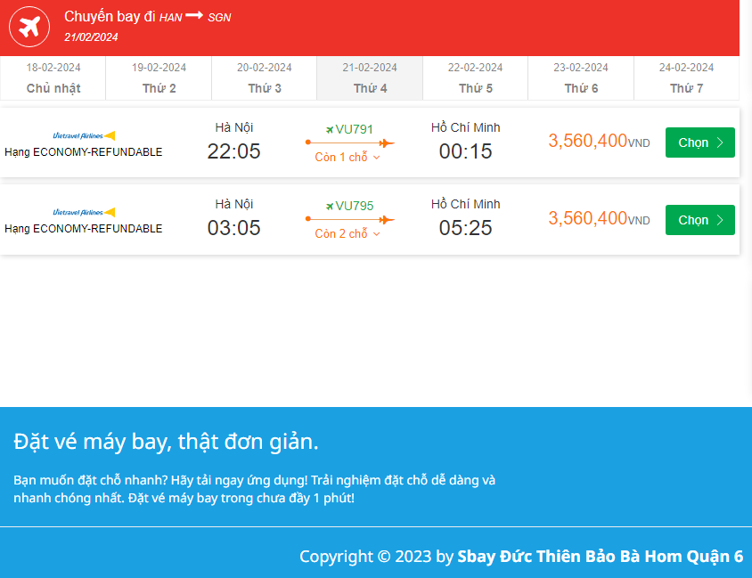 Viettravel Hà Nội Cất cánh: 22:05 Ngày: 21-02-2024 Hồ Chí Minh Hạ cánh: 00:25 Ngày: 22-02-2024 Chuyến bay: VU791 giá vé máy bay 3,245,040VND (giá hãng 3,500,400)