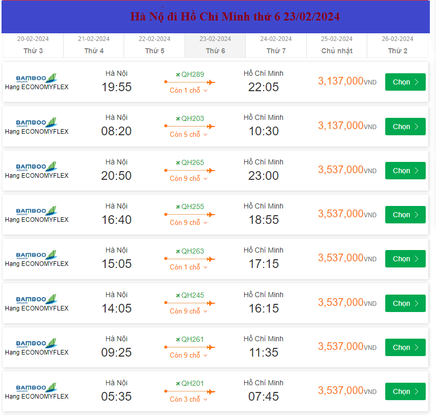 Bamboo Airways Hà Nội Cất cánh: 20:50 Ngày: 23-02-2024 Hồ Chí Minh Hạ cánh: 23:00 Ngày: 23-02-2024 Chuyến bay: QH265 giá vé máy bay 3,137,000VND (giá hãng 3,067,000)