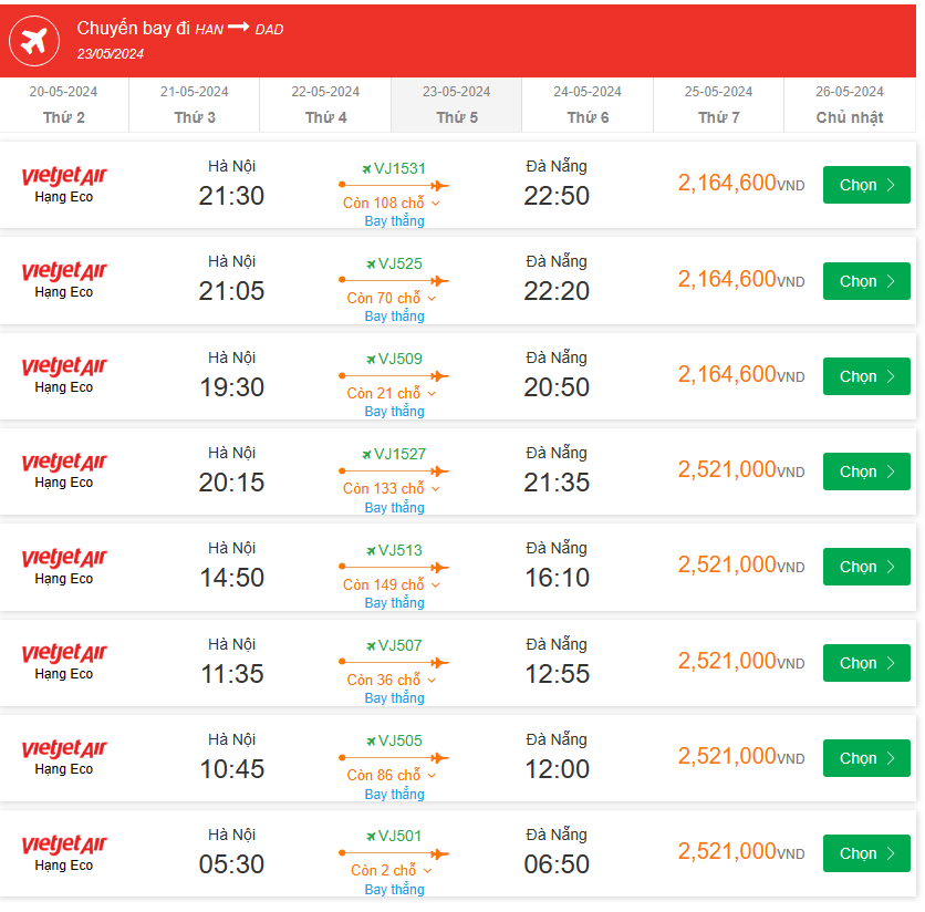 Hãng Vietjet Air VJ525 Bay thẳng Hạng Eco 21:05-22:20 giá vé máy bay 2,164,600