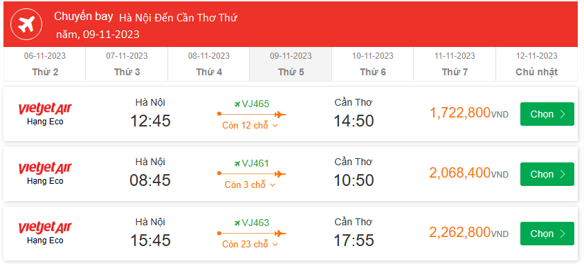 Vietjet Air Hà Nội Cất cánh: 15:45 Ngày: 09-11-2023 Cần Thơ Hạ cánh: 17:55 Ngày: 09-11-2023 Chuyến bay: VJ463 Giá Vé Máy Bay 2,262,800VND