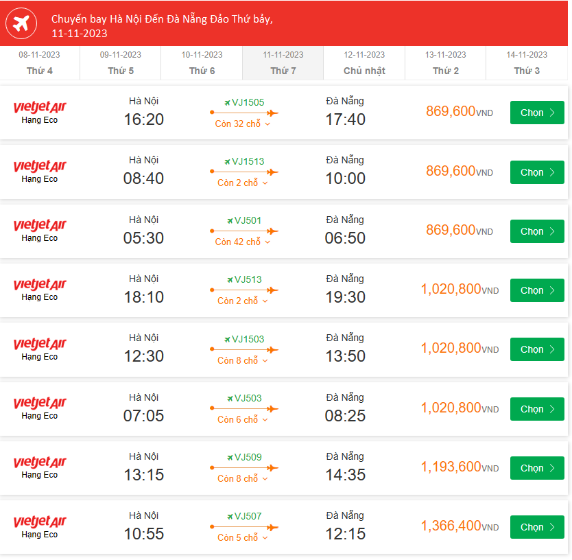 Vietjet Air Hà Nội Cất cánh: 07:05 Ngày: 11-11-2023 Đà Nẵng Hạ cánh: 08:25 Ngày: 11-11-2023 Chuyến bay: VJ503 Giá Vé Máy Bay 1,020,800 VND