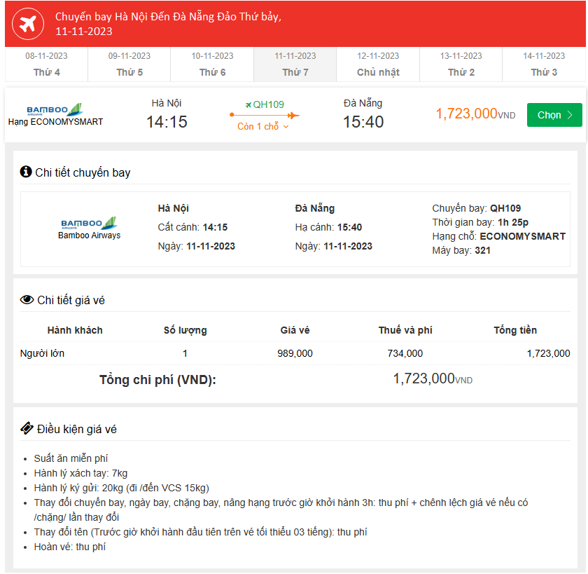 Bamboo Airways Hà Nội Cất cánh: 14:15 Ngày: 11-11-2023 Đà Nẵng Hạ cánh: 15:40 Ngày: 11-11-2023 Chuyến bay: QH109 Giá Vé Máy Bay 1,723,000 VND