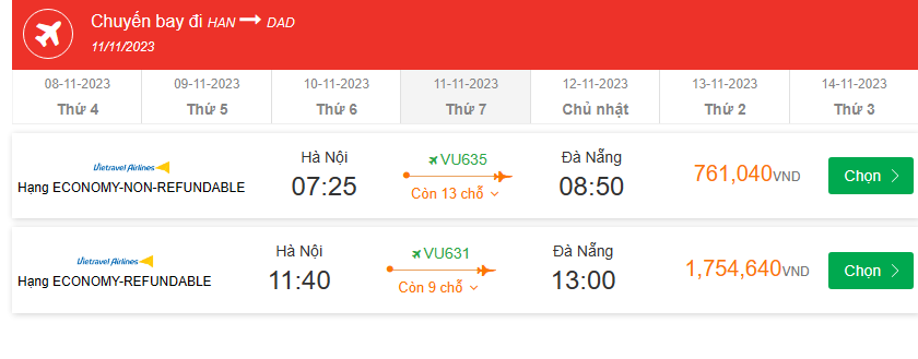 Viettravel Hà Nội Cất cánh: 07:25 Ngày: 11-11-2023 Đà Nẵng Hạ cánh: 08:50 Ngày: 11-11-2023 Chuyến bay: VU635 Giá Vé Máy Bay 761,040 VND