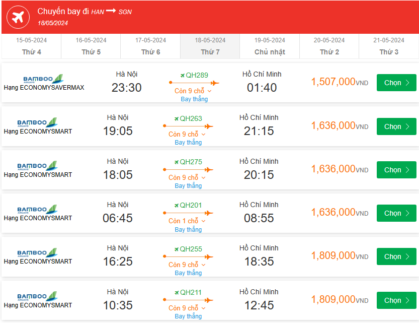 QH275 Bay thẳng Hạng ECONOMYSMART 18:05-20:15 giá vé máy bay 1,636,000