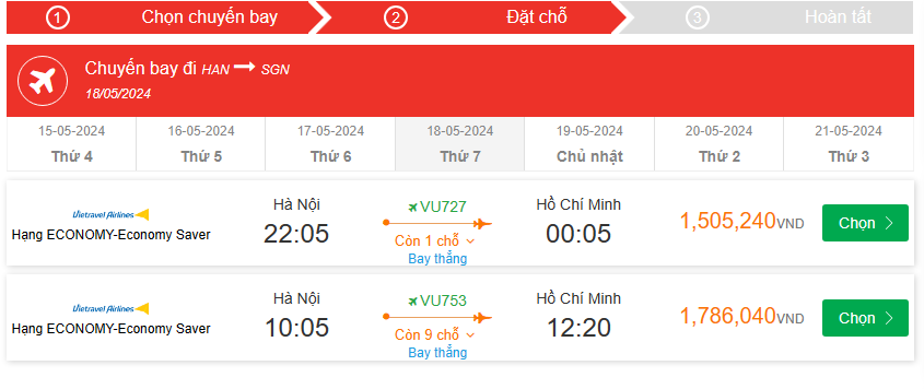 VU727 Bay thẳng Hạng ECONOMY-Economy Saver 22:05-00:05 giá vé máy bay 1,505,240