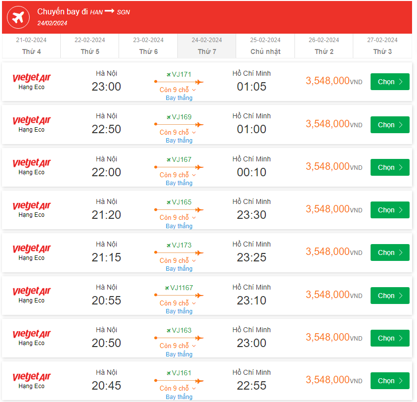 VN221 Bay thẳng Hạng H 21:00-23:15 giá vé 3,198,000