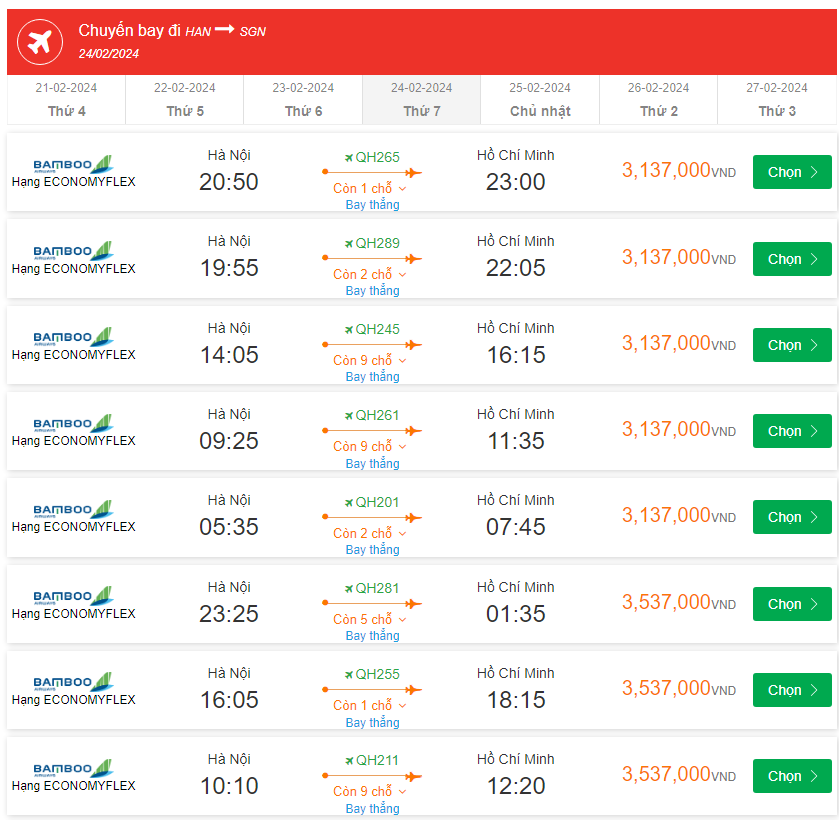 QH265 Bay thẳng Hạng ECONOMYFLEX 20:50-23:00 giá vé 3,137,000