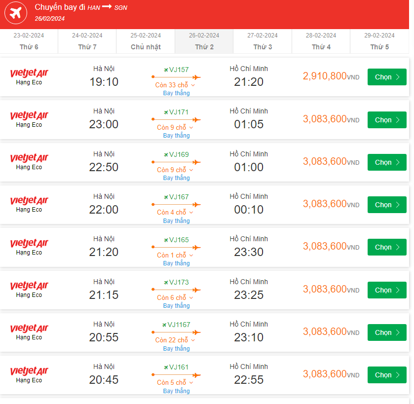 VJ1167 Bay thẳng Hạng Eco 20:55-23:10 giá vé 3,083,600