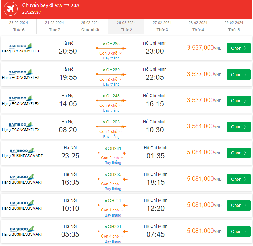 QH265 Bay thẳng Hạng ECONOMYFLEX 20:50-23:00 giá vé 3,537,000