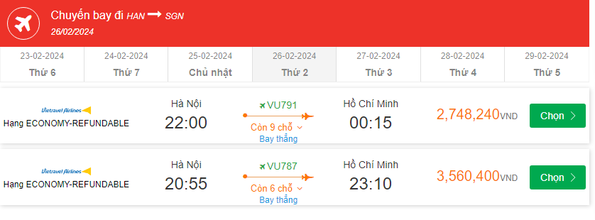 VU791 Bay thẳng Hạng ECONOMY-REFUNDABLE 22:00-00:15 giá vé 2,748,240