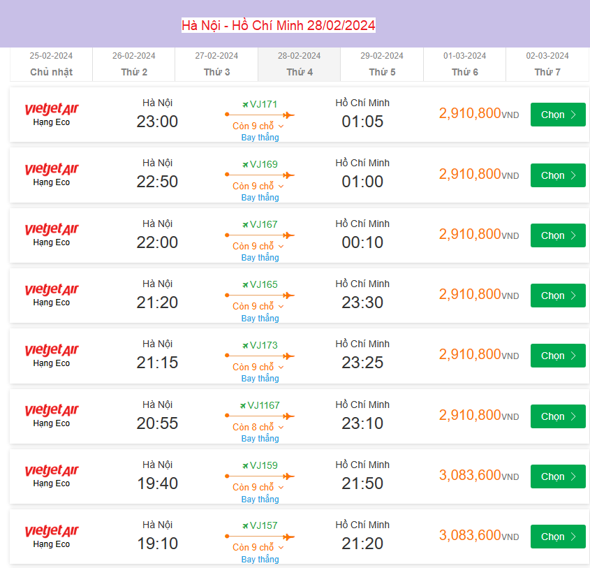 VJ167 Bay thẳng Hạng Eco 22:00-00:10 giá vé 2,910,800