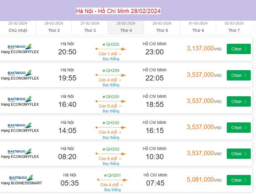 QH255 Bay thẳng Hạng ECONOMYFLEX 16:40-18:55 giá vé 3,537,000