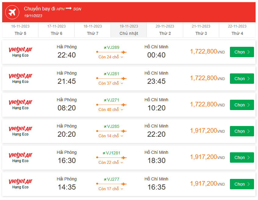 Hải Phòng Đến Hồ Chí Minh chủ nhật 19-11-2023