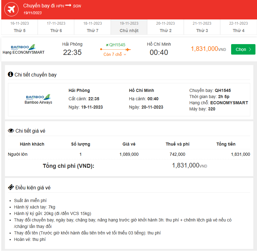 Bamboo Airways Hải Phòng Cất cánh: 22:35 Ngày: 19-11-2023 Hồ Chí Minh Hạ cánh: 00:40 Ngày: 20-11-2023 Chuyến bay: QH1545 Giá Vé Máy Bay 1,831,000VND