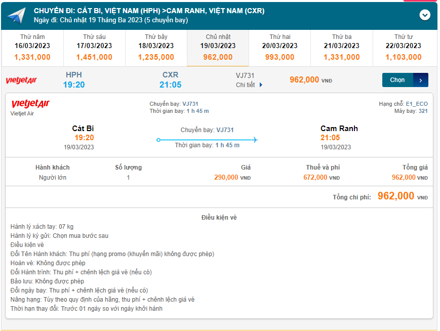 Hải Phòng (HPH) Đến Nha Trang (CXR) 19/03/2023