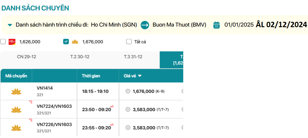 Hồ Chí Minh - Buôn Ma Thuột 01/01/2025 ÂL 02/12/2024