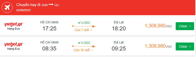 Vietjet Air Hồ Chí Minh Cất cánh: 08:35 Ngày: 02-06-2023 Đà Lạt Hạ cánh: 09:25 Ngày: 02-06-2023 Chuyến bay: VJ360 giá vé 1,308,980VND