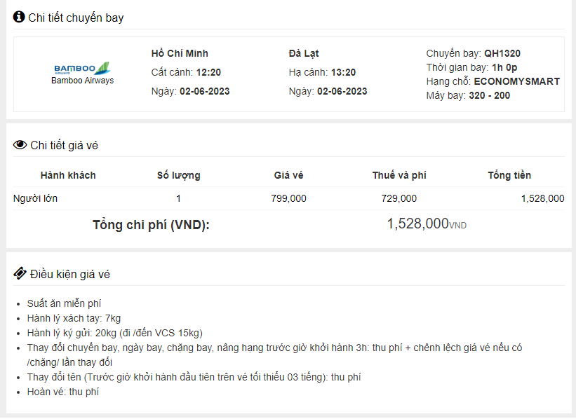 Bamboo Airways Hồ Chí Minh Cất cánh: 12:20 Ngày: 02-06-2023 Đà Lạt Hạ cánh: 13:20 Ngày: 02-06-2023 Chuyến bay: QH1320 giá vé 1,528,000VND