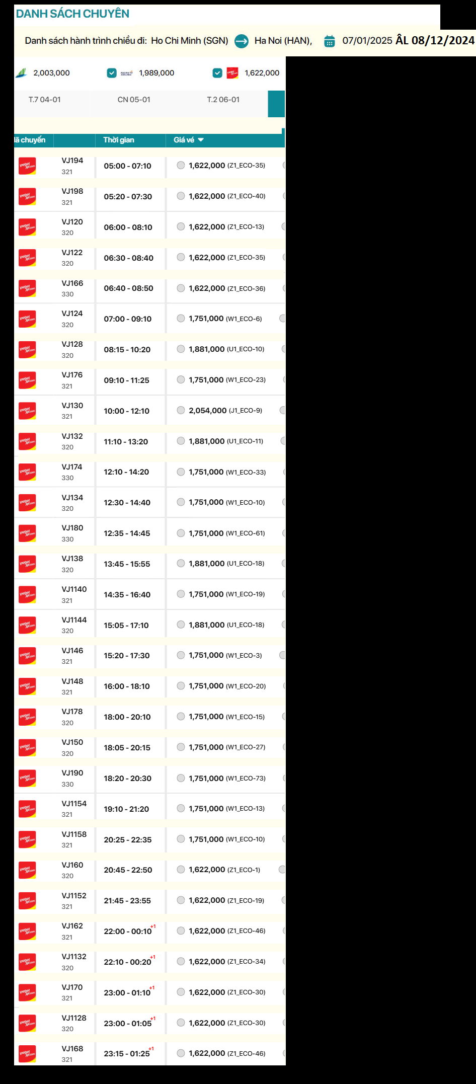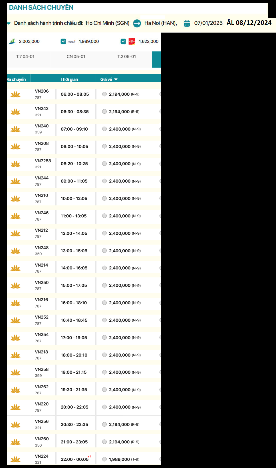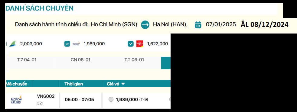 Hồ Chí Minh đến Hà Nội 07/01/2025 ÂL 08/12/2024