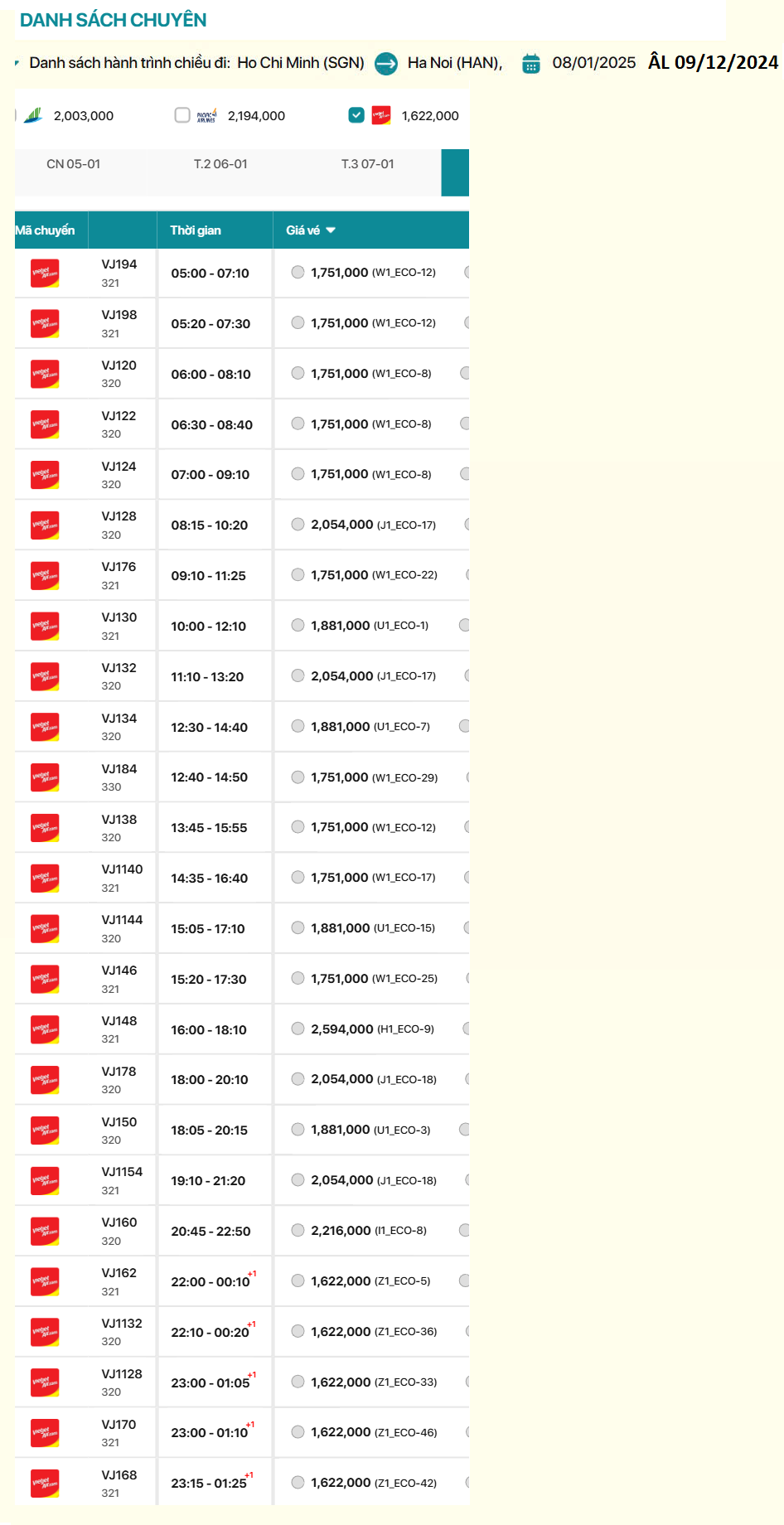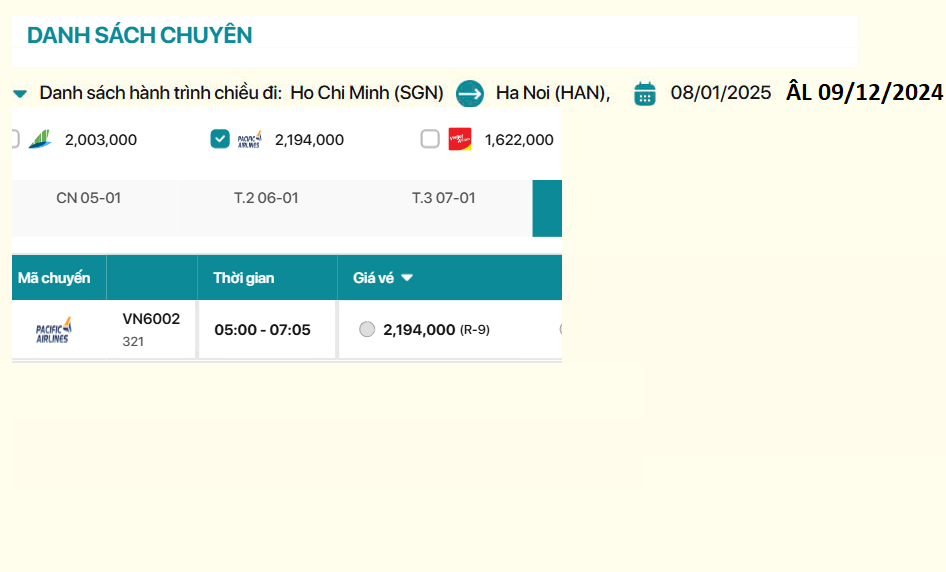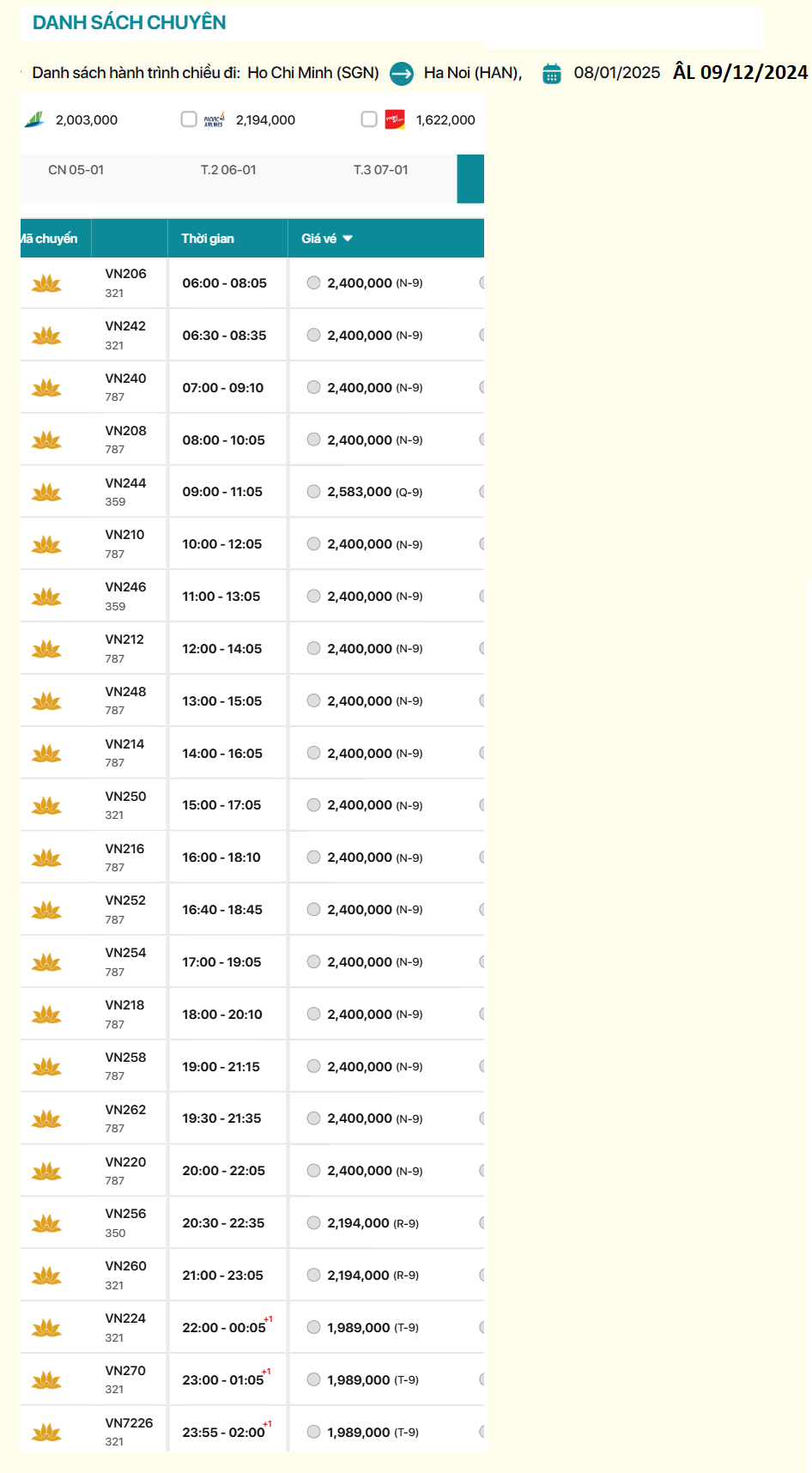 Hồ Chí Minh đến Hà Nội 08/01/2025 ÂL 09/12/2024