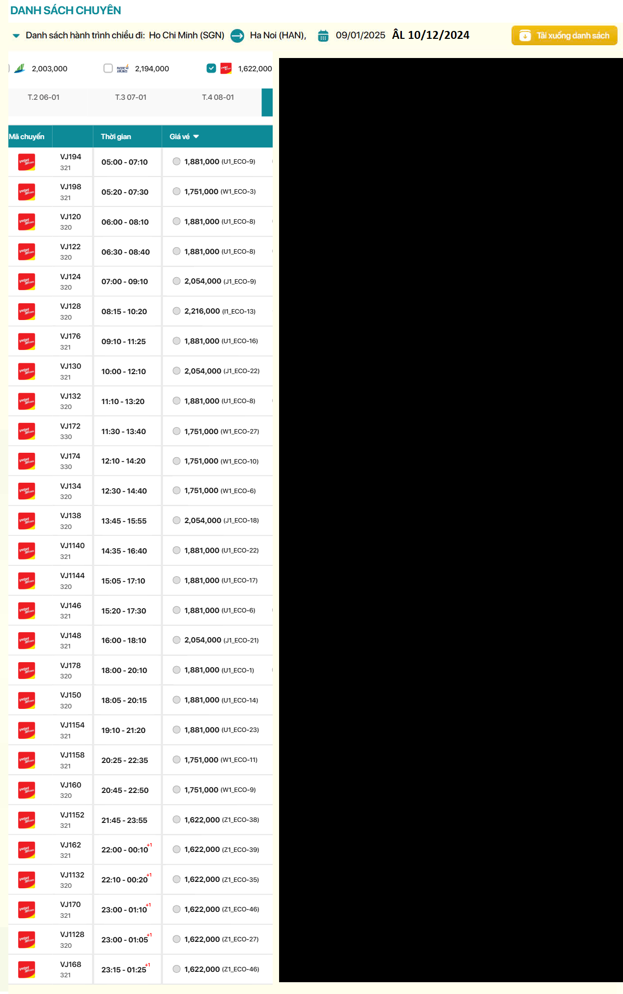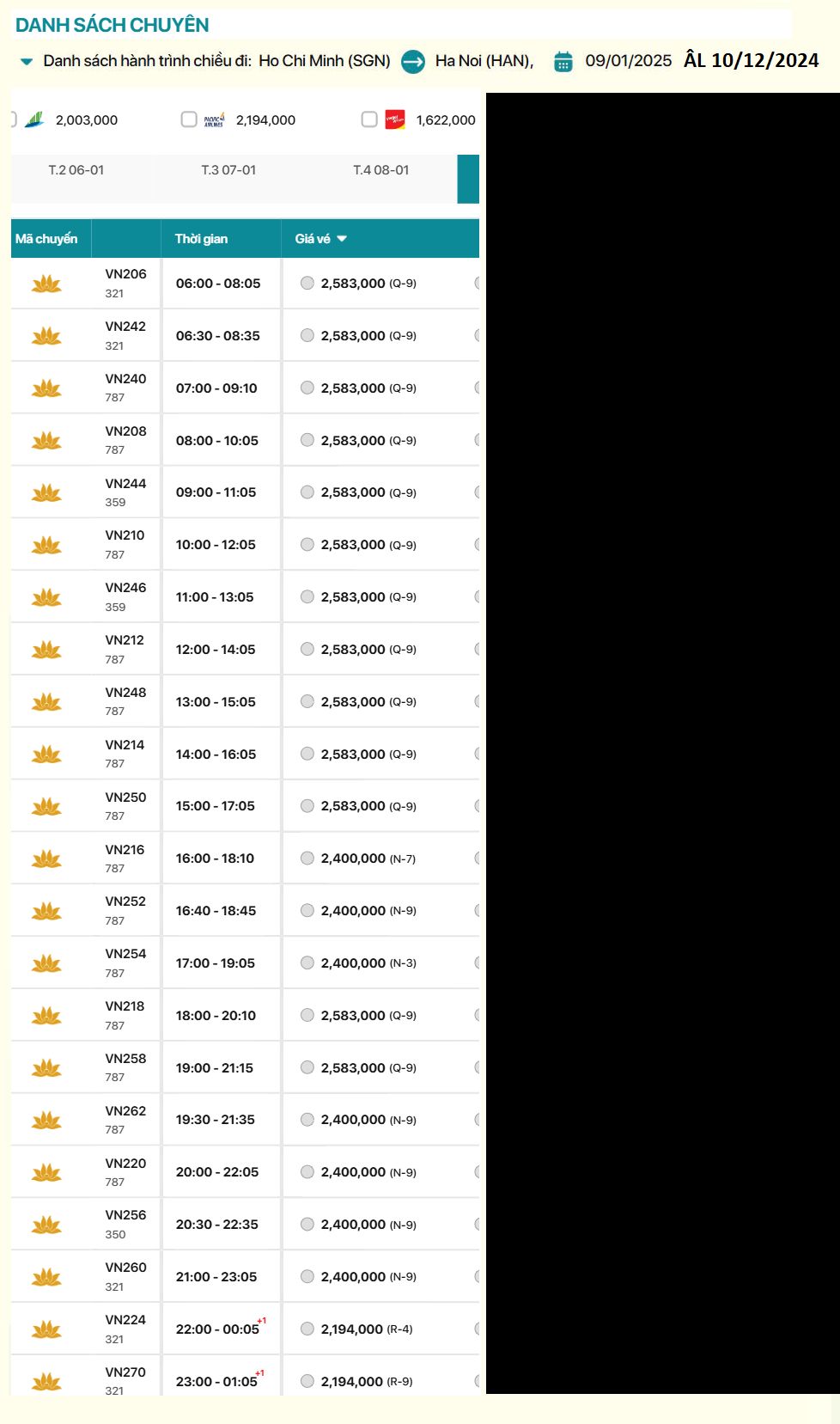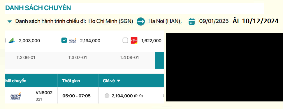Hồ Chí Minh đến Hà Nội 09/01/2025 ÂL 10/12/2024