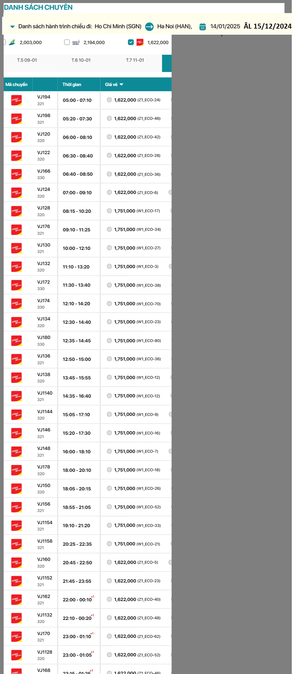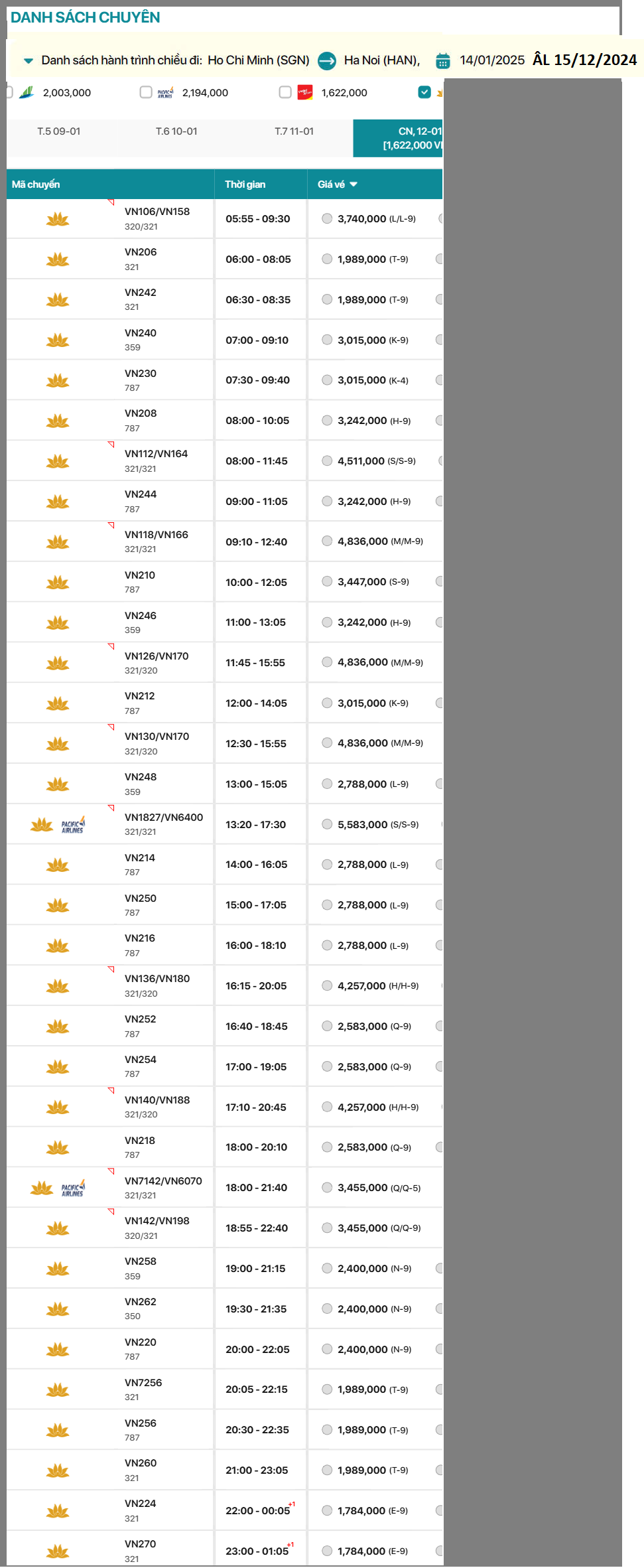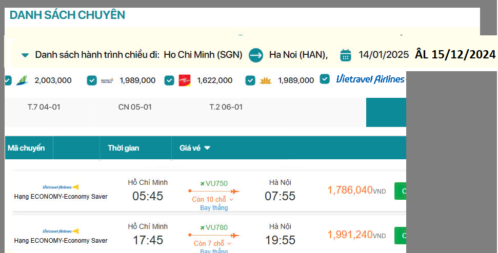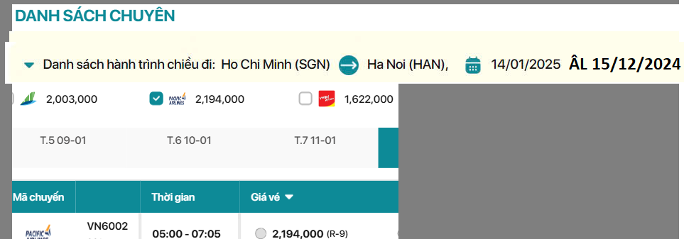 Hồ Chí Minh đến Hà Nội 14/01/2025 ÂL 15/12/2024