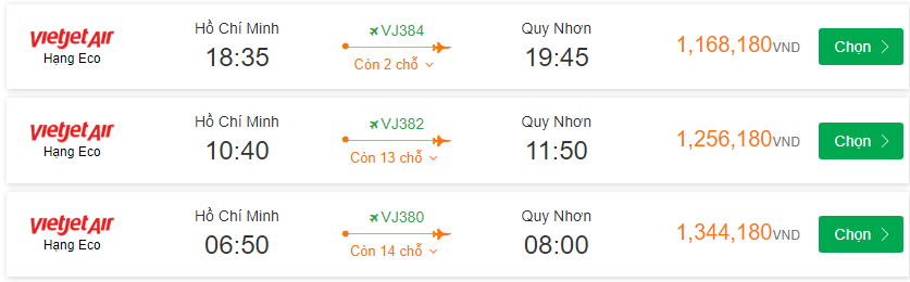 Vietjet Air Hồ Chí Minh Cất cánh: 18:35 Ngày: 08-06-2023 Quy Nhơn Hạ cánh: 19:45 Ngày: 08-06-2023 Chuyến bay: VJ384 giá vé máy bay 1,168,180VND