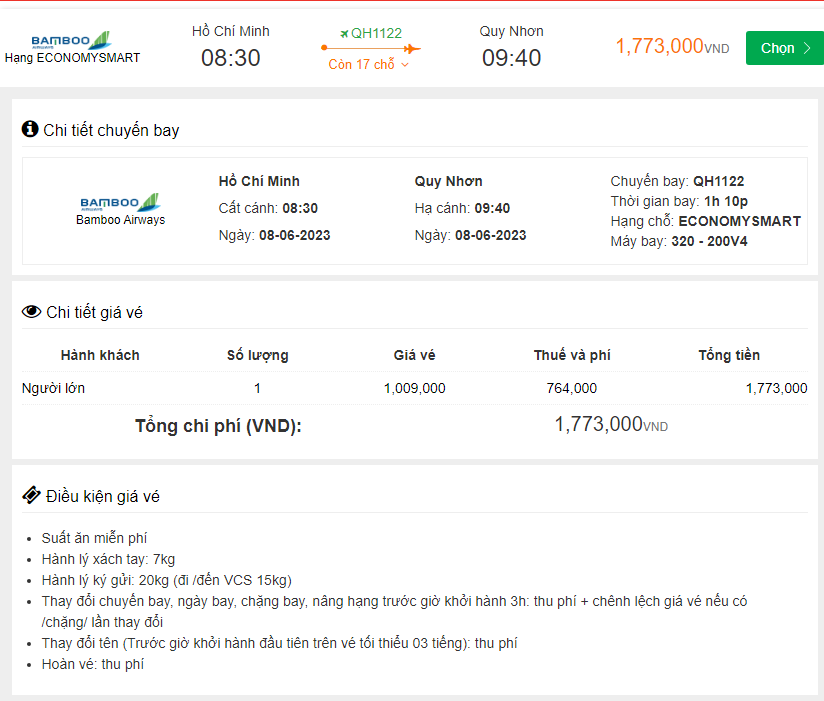 Bamboo Airways Hồ Chí Minh Cất cánh: 08:30 Ngày: 08-06-2023 Quy Nhơn Hạ cánh: 09:40 Ngày: 08-06-2023 Chuyến bay: QH1122 giá vé máy bay 1,773,000VND