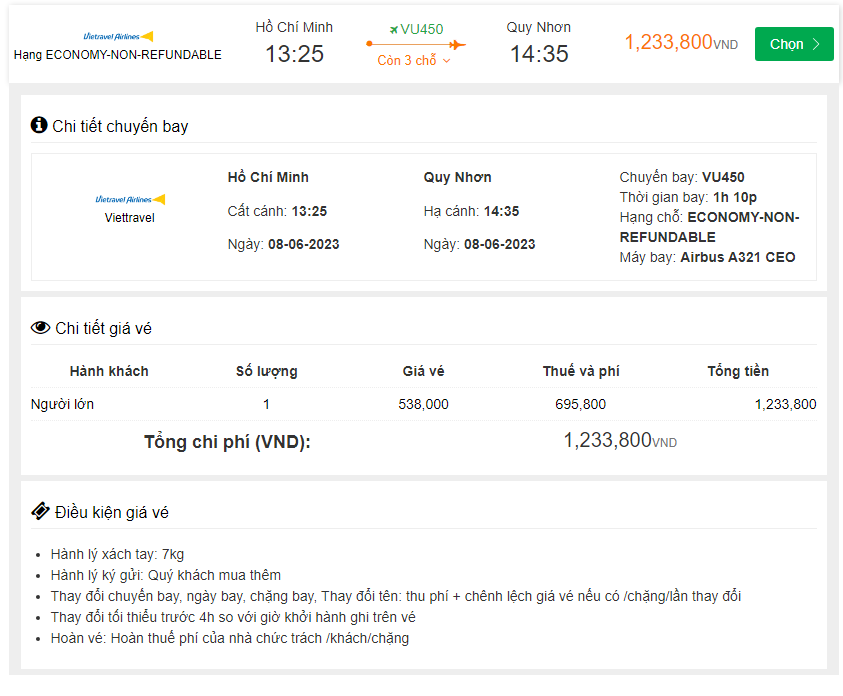Viettravel Hồ Chí Minh Cất cánh: 13:25 Ngày: 08-06-2023 Quy Nhơn Hạ cánh: 14:35 Ngày: 08-06-2023 Chuyến bay: VU450 giá vé máy bay 1,233,800VND