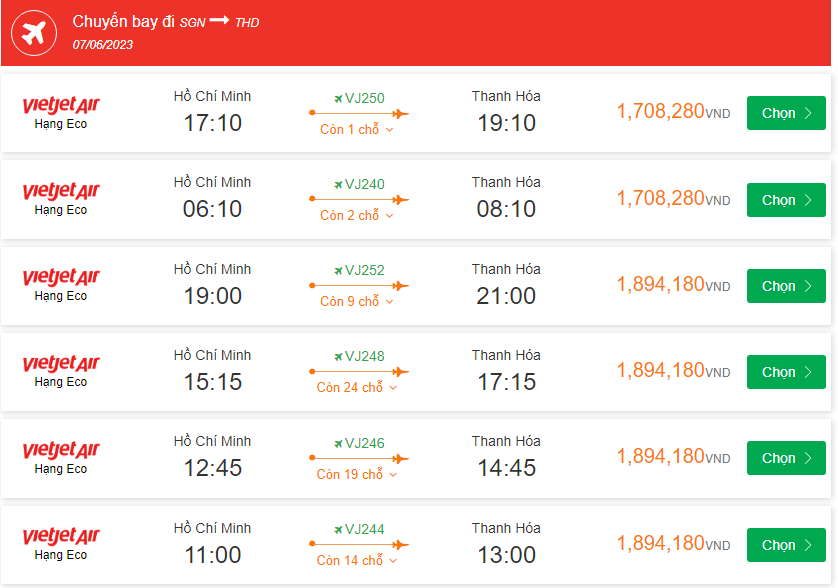 Vietjet Air Hồ Chí Minh Cất cánh: 17:10 Ngày: 07-06-2023 Thanh Hóa Hạ cánh: 19:10 Ngày: 07-06-2023 Chuyến bay: VJ250 giá vé máy bay 1,708,280VND