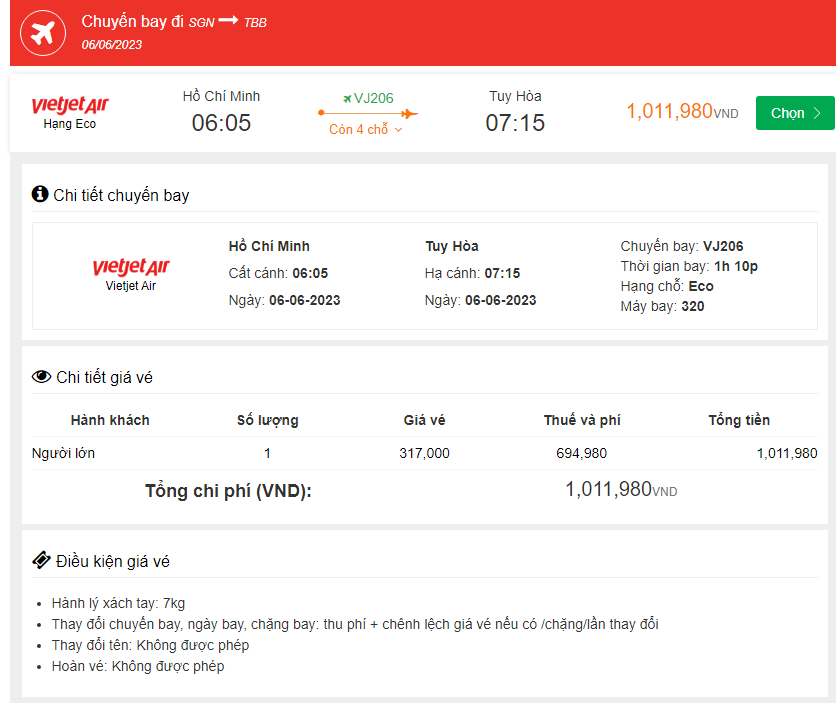 Hồ Chí Minh Đến Tuy Hòa 06/06/2023