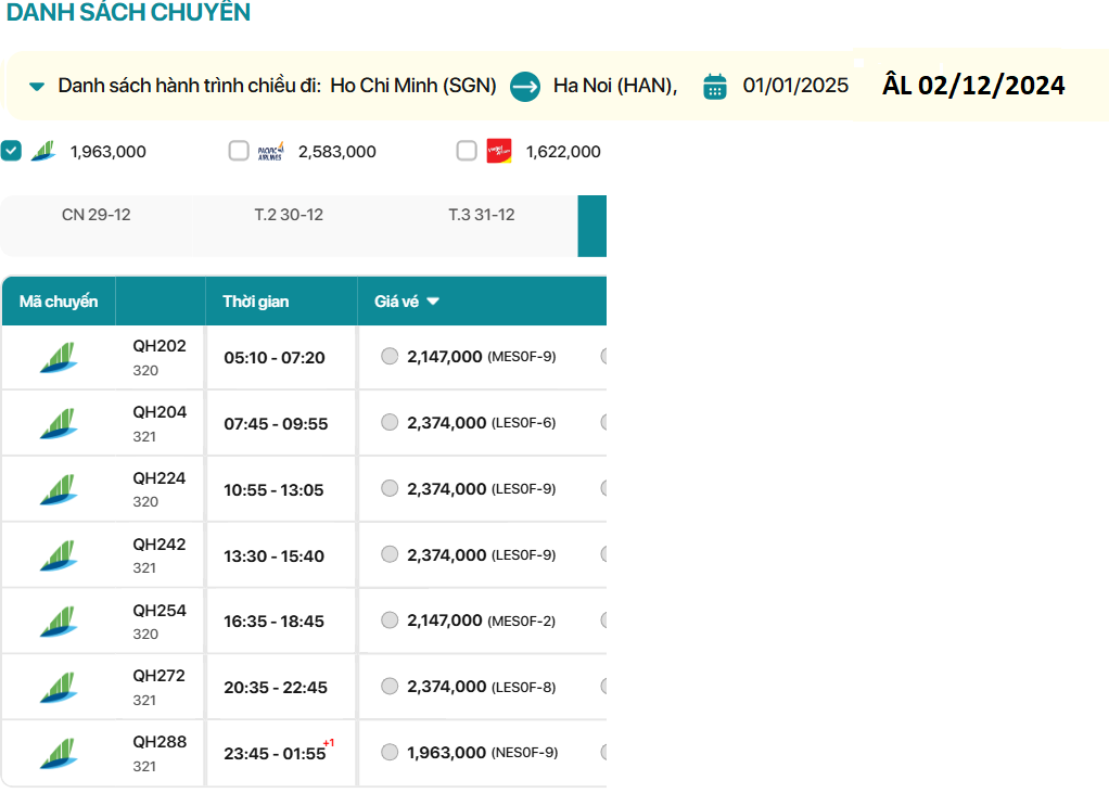 QH288 Bay thẳng Hạng ECONOMYSMART 23:45-01:55 vé máy bay 2,003,000
