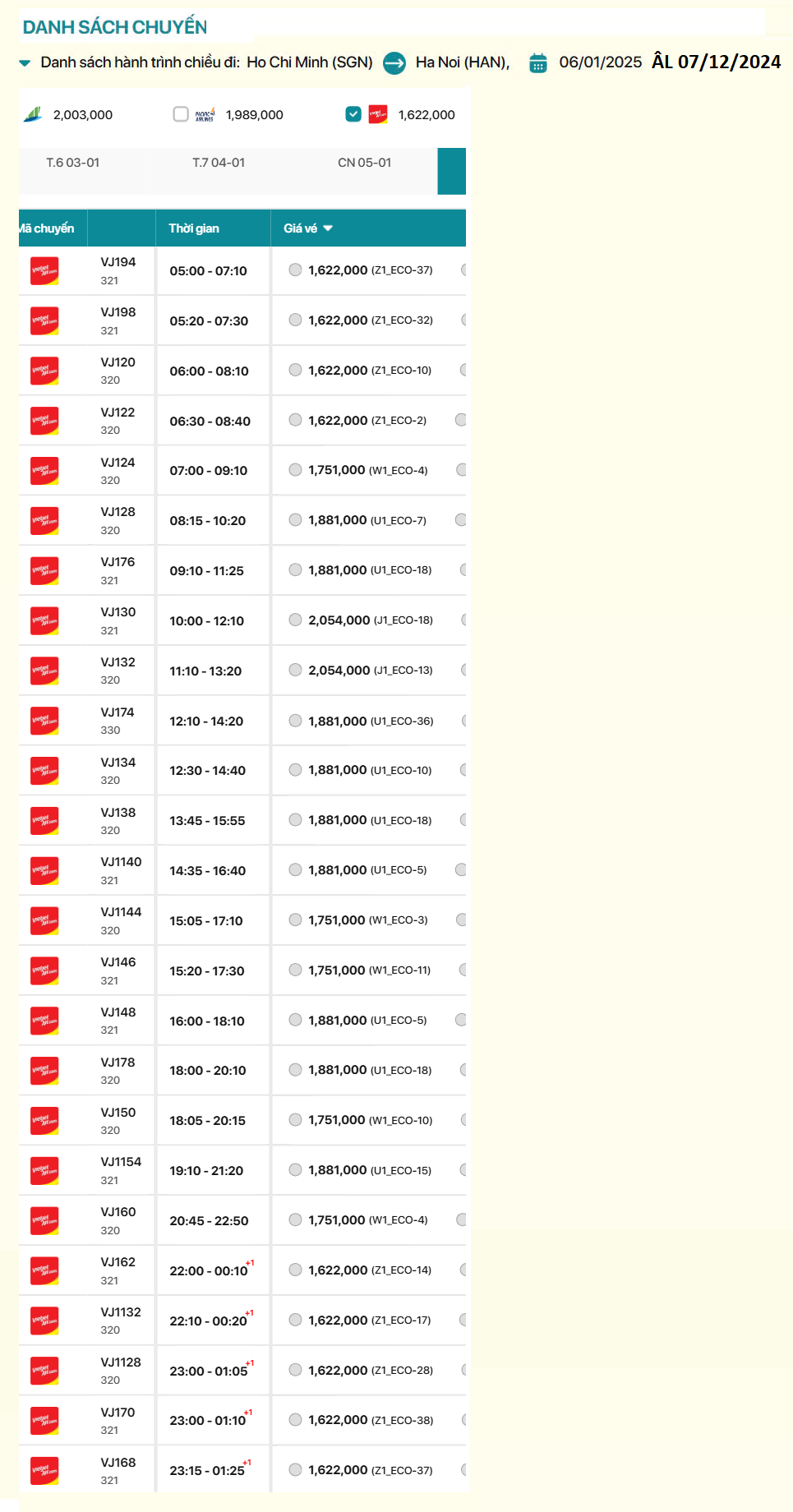 Hãng Vietjet Air VJ198 Bay thẳng Hạng Eco 05:20 - 07:30 vé máy bay 1,755,600