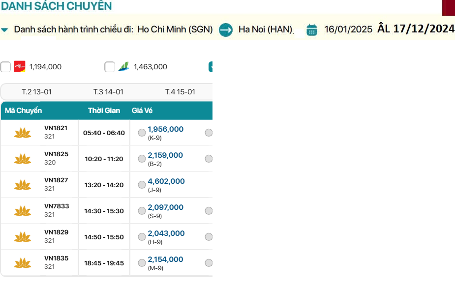 Hãng Vietnam Airlines VN1825 Bay thẳng Hạng B 10:20-11:20 vé máy bay 2,159,000