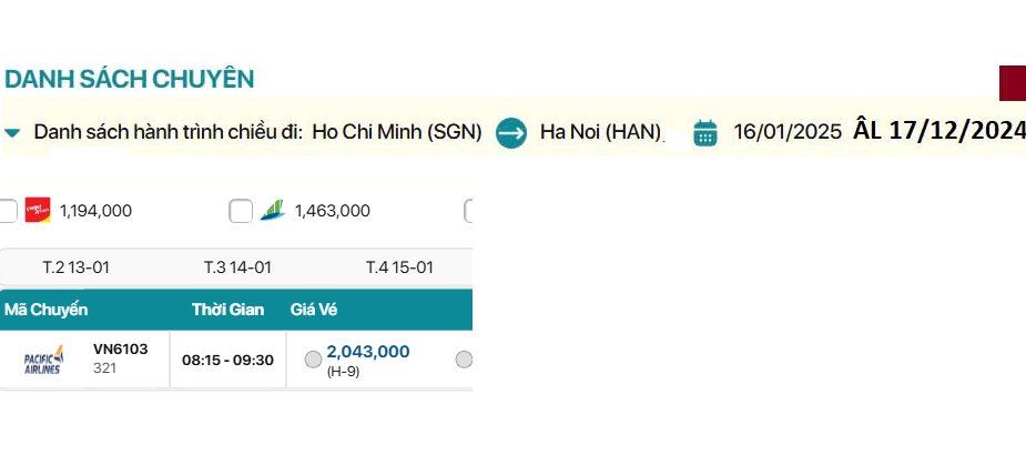 Hãng Vietnam Airlines VN6103 Bay thẳng Hạng H 08:15-09:30 vé máy bay 2,043,000