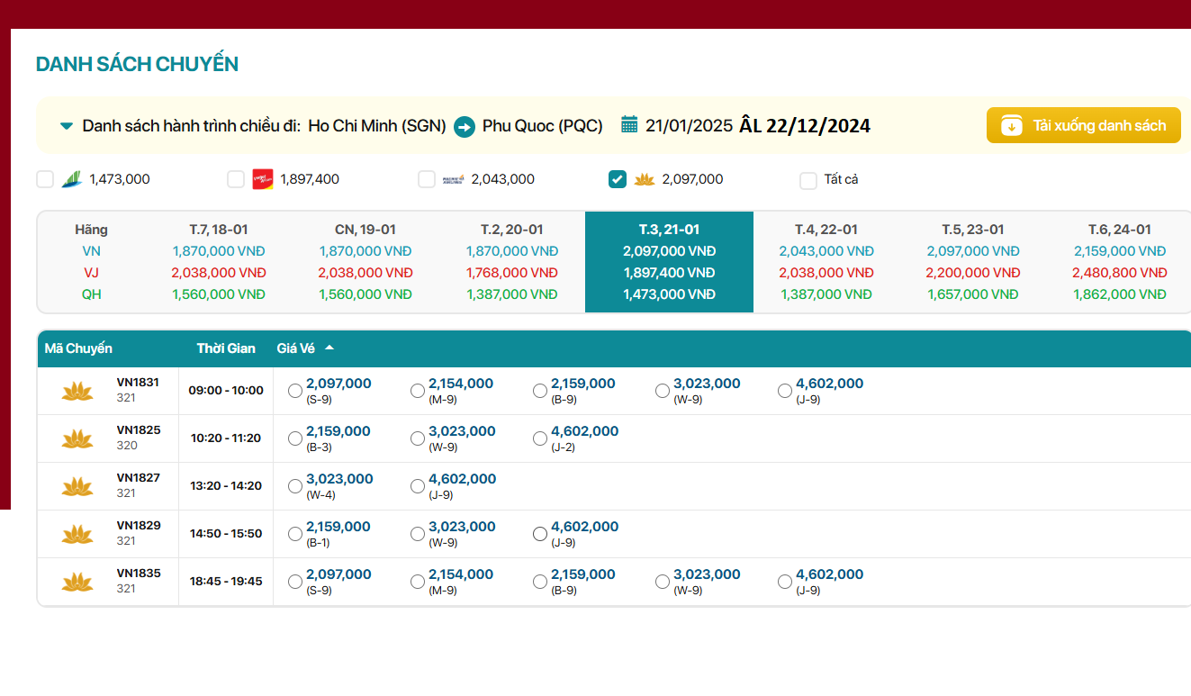Hãng Vietnam Airlines VN1831 Bay thẳng Hạng S 09:00-10:00 vé máy bay 2,097,000