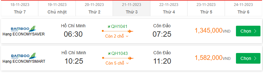 Bamboo Airways Hồ Chí Minh Cất cánh: 10:25 Ngày: 21-11-2023 Côn Đảo Hạ cánh: 11:20 Ngày: 21-11-2023 Chuyến bay: QH1043 Giá Vé Máy Bay 1,582,000VND