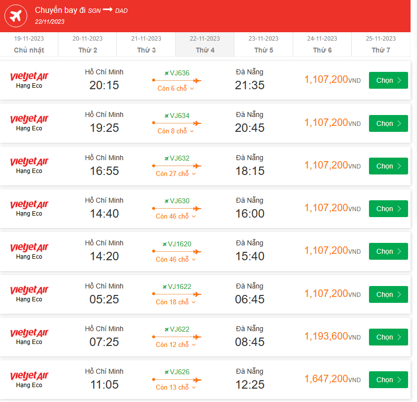 Vietjet Air Hồ Chí Minh Cất cánh: 20:15 Ngày: 22-11-2023 Đà Nẵng Hạ cánh: 21:35 Ngày: 22-11-2023 Chuyến bay: VJ636 Giá Vé Máy Bay 1,107,200VND