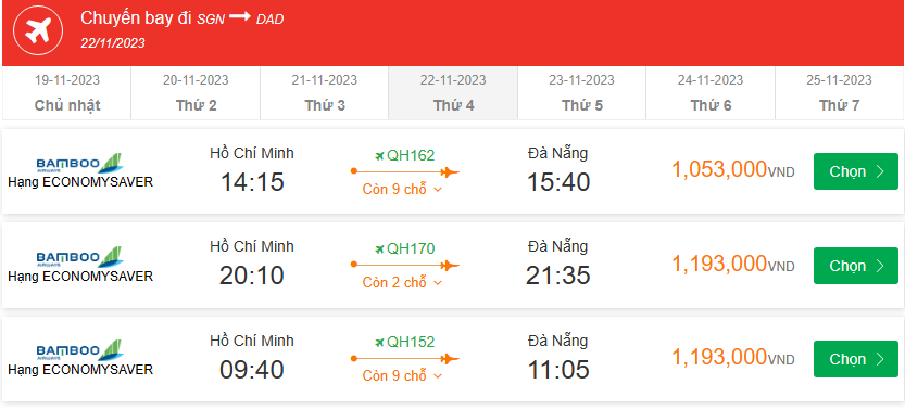 Bamboo Airways Hồ Chí Minh Cất cánh: 14:15 Ngày: 22-11-2023 Đà Nẵng Hạ cánh: 15:40 Ngày: 22-11-2023 Chuyến bay: QH162 Giá Vé Máy Bay 1,053,000VND