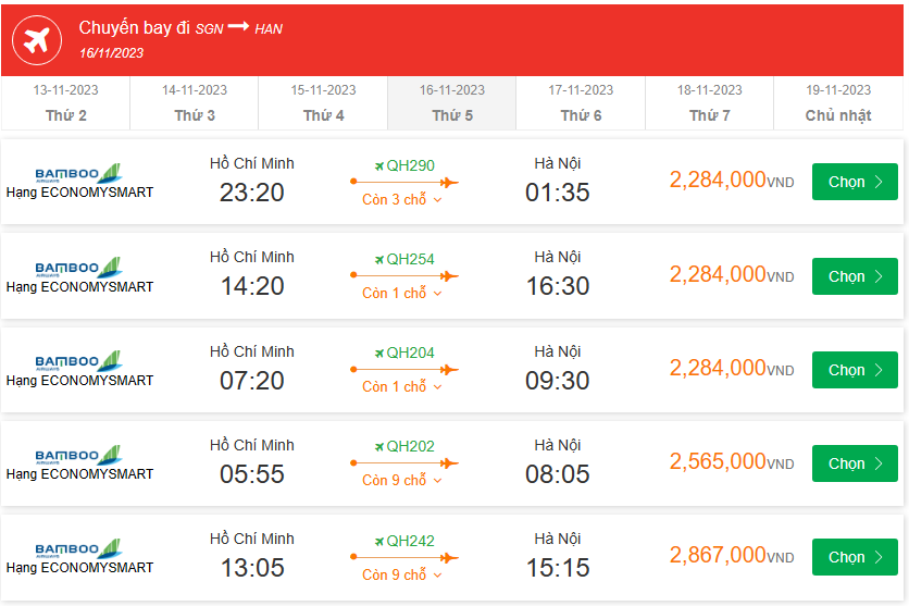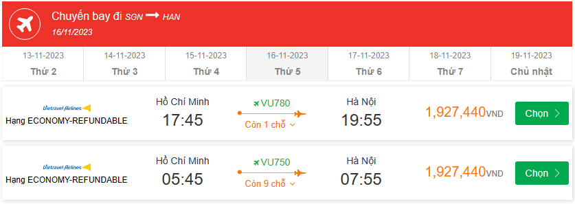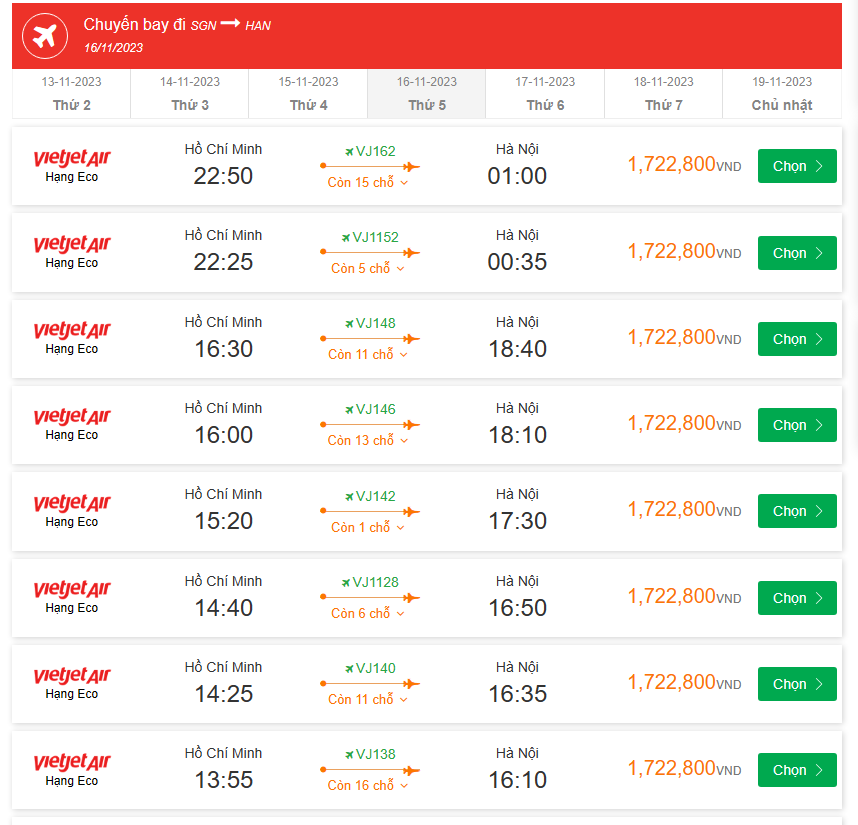 Hồ Chí Minh (SGN) Đến Hà Nội (HAN thứ năm 16-11-2023