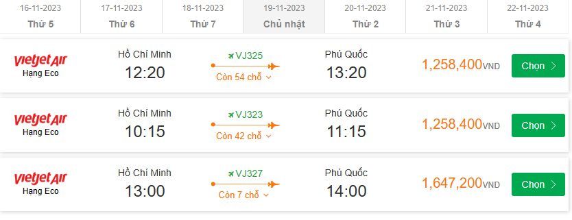 Hồ Chí Minh (SGN) Đến Phú Quốc (PQC) chủ nhật 19-11-2023