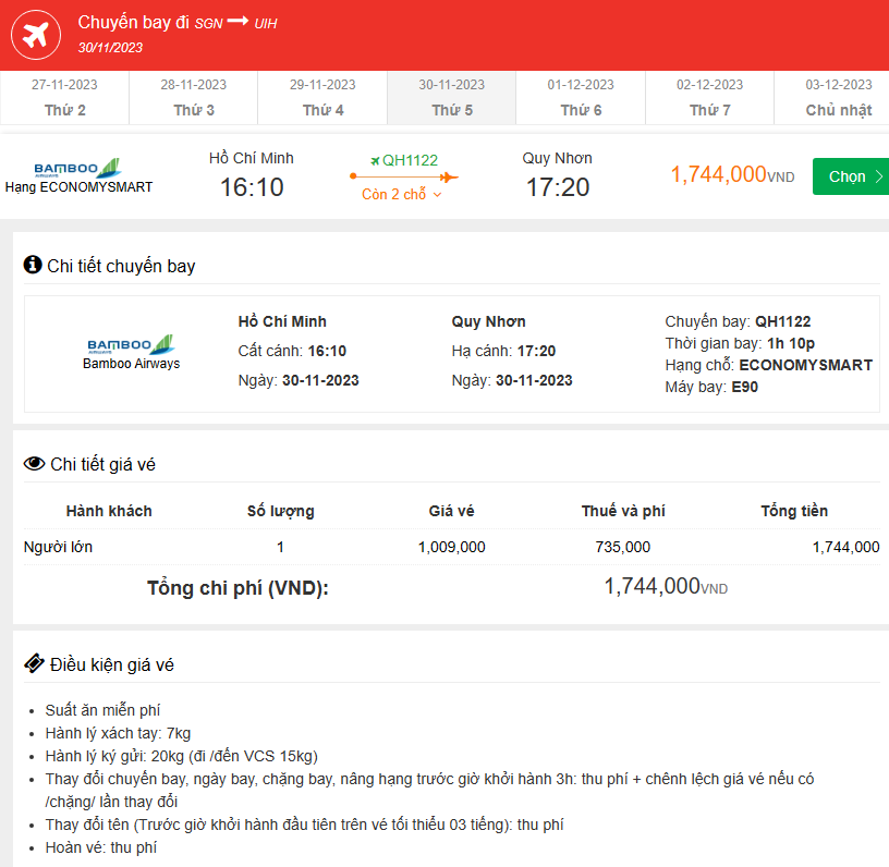 Bamboo Airways Hồ Chí Minh Cất cánh: 16:10 Ngày: 30-11-2023 Quy Nhơn Hạ cánh: 17:20 Ngày: 30-11-2023 Chuyến bay: QH1122 Giá Vé Máy Bay 1,744,000VND