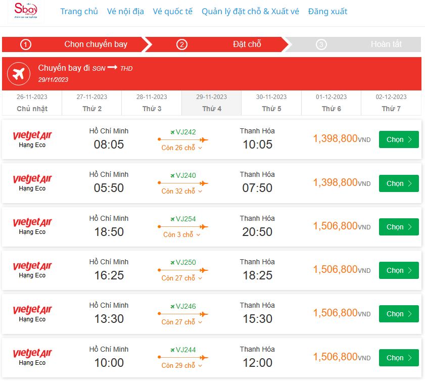 Vietjet Air Hồ Chí Minh Cất cánh: 08:05 Ngày: 29-11-2023 Thanh Hóa Hạ cánh: 10:05 Ngày: 29-11-2023 Chuyến bay: VJ242 Giá Vé Máy Bay 1,398,800VND