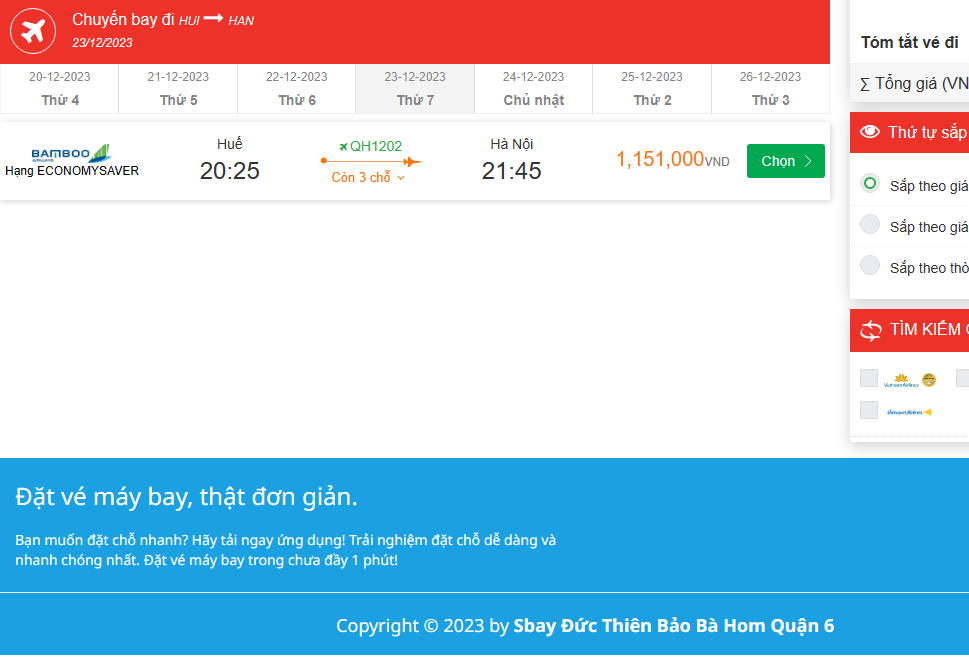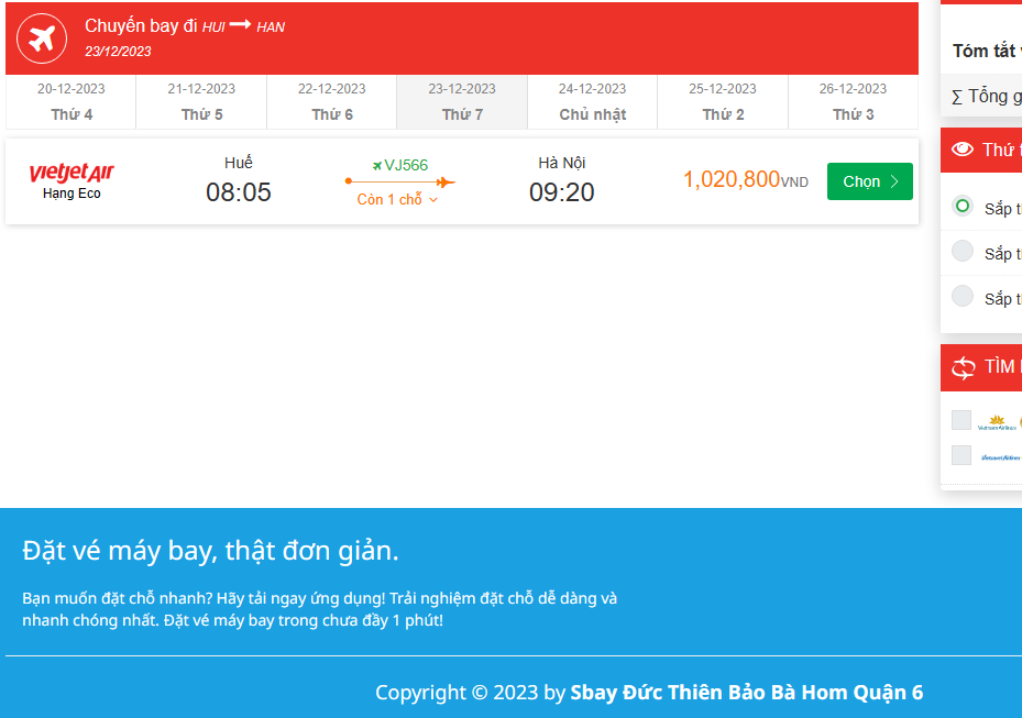 Huế (HUI) Đến Hà Nội (HAN) thứ bảy 23-12-2023