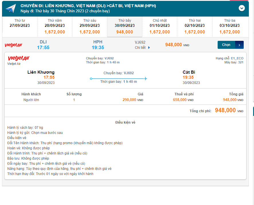 Liên Khương (DLI) đến Cát Bi (HPH) thứ bảy 30/09/2023